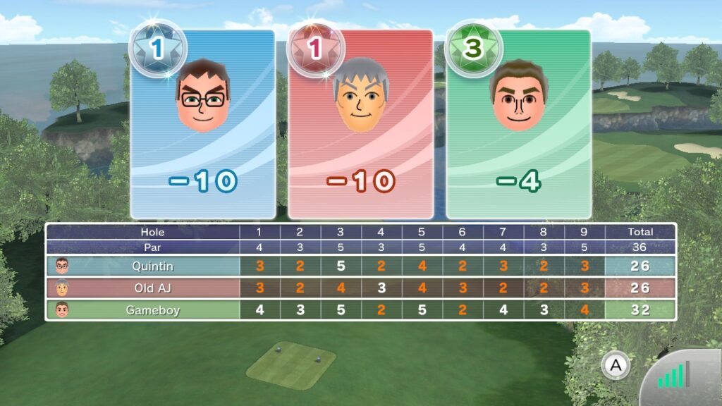 Hole 8 saw nearly a challenge but still ended with a positive score there. Despite Gameboy’s slip on the Putt, he still makes a Par. Both Mr B.F.F managed to 3 Wood their way to safety and get the Birdie. Hole 9 concluded with 0 MPH and that all players scored positively to end their runs. Gameboy plays it safe and get through two islands to the rough but recovers with a tough putt for Birdie which he pulls off safely. The other players went for the shortcut island.