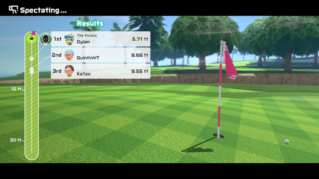 In 3 Holes Random, with a room of five players, and no CPUs this time, they take Random in Classic A. all of the players tied for Holes 1 and 2 until two players, including Mr B.F.F slipped up with a Birdie and those who had three eagles moved onto the Closest to Pin Shot decider. In the pin shot tiebreak, they got thrown Hole Resort 7. Down below are the results of the Pin Shot tiebreaker.