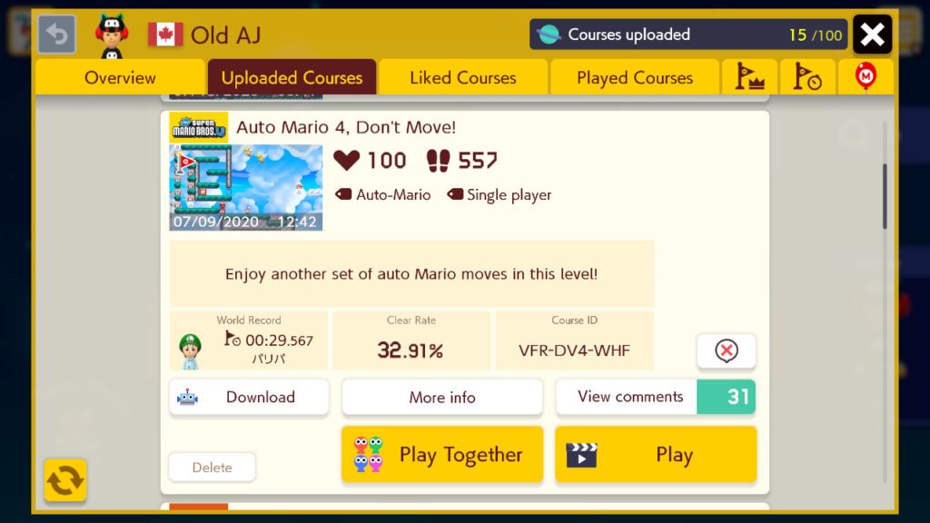 His Auto Mario levels have opened to great numbers with “Auto Mario 4, Don’t Move!” as his most popular with 557 plays and 100 likes. This is the current ratings right now as of the time of this post. With that, he boasts 100 likes for the first time on Mario Maker. Mr B.F.F considers that and his other Auto Mario levels to be his best plays of his profile.