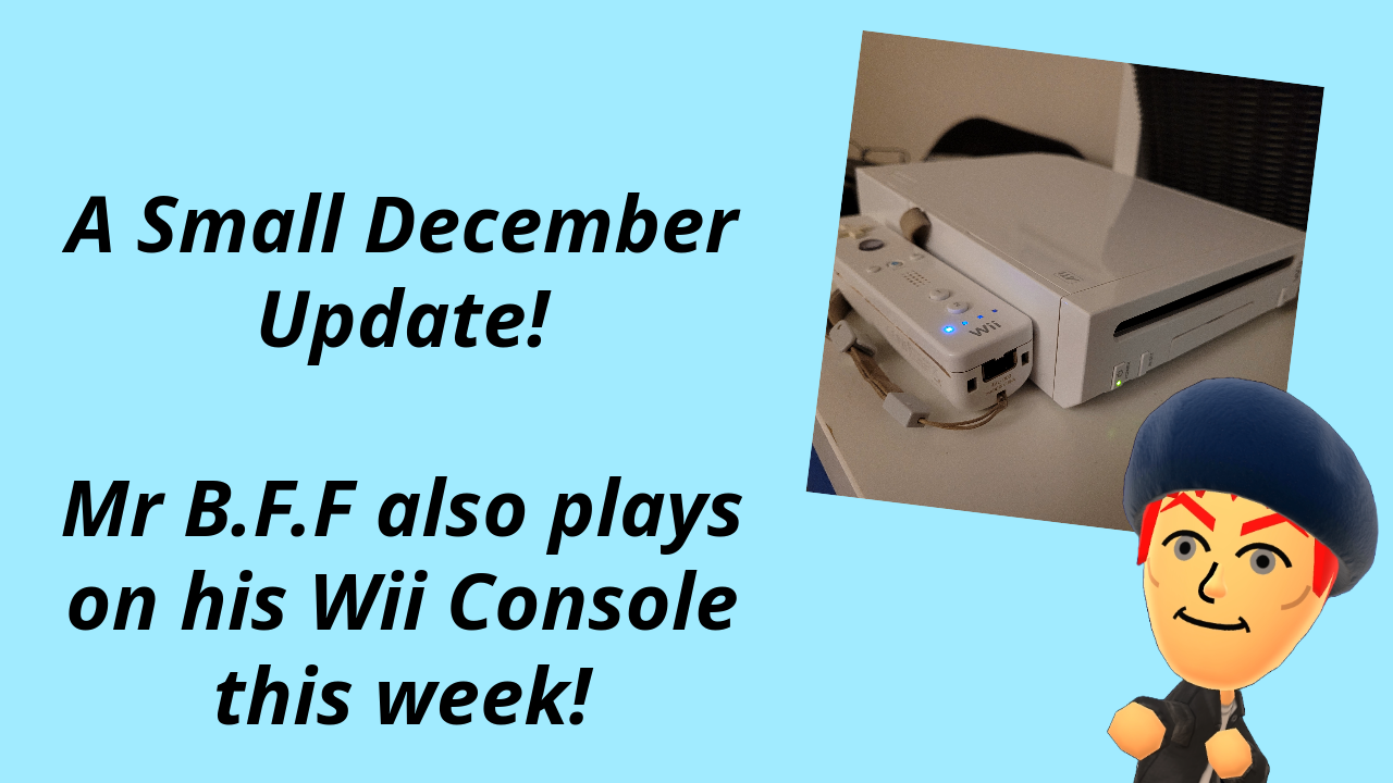 Hello everyone. The Team has been busy in many ways. How chilling was it? We all know that for sure. It was also relaxing in some ways too. And now, it’s the final month of 2023. December. It’s always nice because the kids are off from school for the Winter Break, and so is our Team. Once we get to the middle of the month, Mr B.F.F will be planning ahead for new challenges coming his way. He’s going back to his Original Wii console.