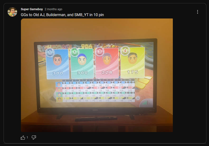 Shortly after the 2nd game, CenturyBuilder and Mr B.F.F took their own screenshots of the Full Lobby encounter. Super Gameboy would community post on his YouTube channel of the 2nd game after praising it for a Comeback to Tie. “GGs to Old AJ, Builderman, and SMB_YT in 10 pin”.
