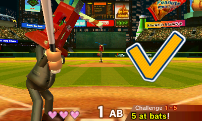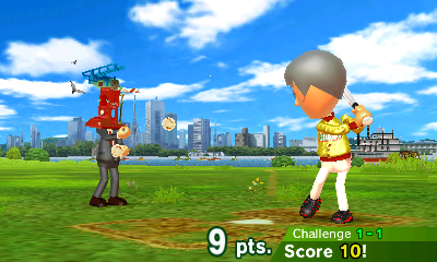 A unique challenge is batting away the bomb ball and hitting UFOs with the timing of the pitch. They make things more spicier in the Challenges. Then, in the Hi-Score Derby modes, the A version combines all elements into one. It starts off easy at first, but then gets harder as you go win more points.
